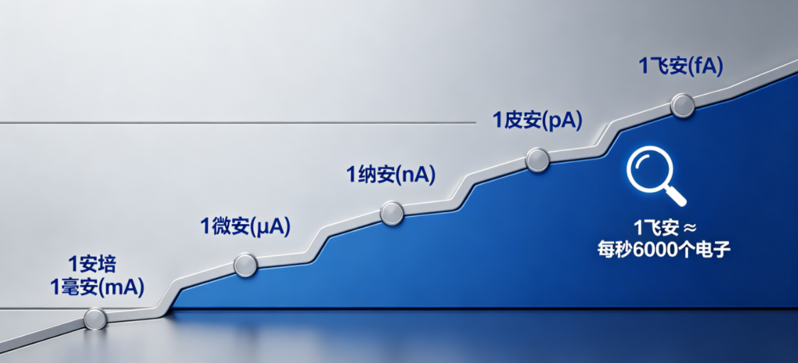在电子测量领域,毫安(mA)是日常电器的电流尺度,微安(μA)是低功耗芯片的待机电流尺度,纳安(nA)是部分高精度传感器的工作电流,皮安(pA)已经进入微弱信号测量领域,而飞安(fA)则是一个“小数点后15位的世界”。