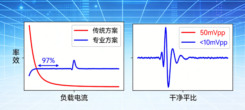 图:专业电源方案vs传统方案效率对比,轻载效率提升30%