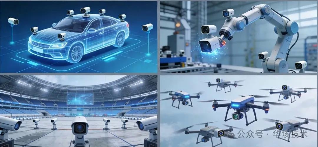 广泛应用场景 – 自动驾驶/工业机器人/安防监控/无人机360°周视感知+前向双目立体视觉,实现全场景环境感知,满足L3+级自动驾驶视觉需求。